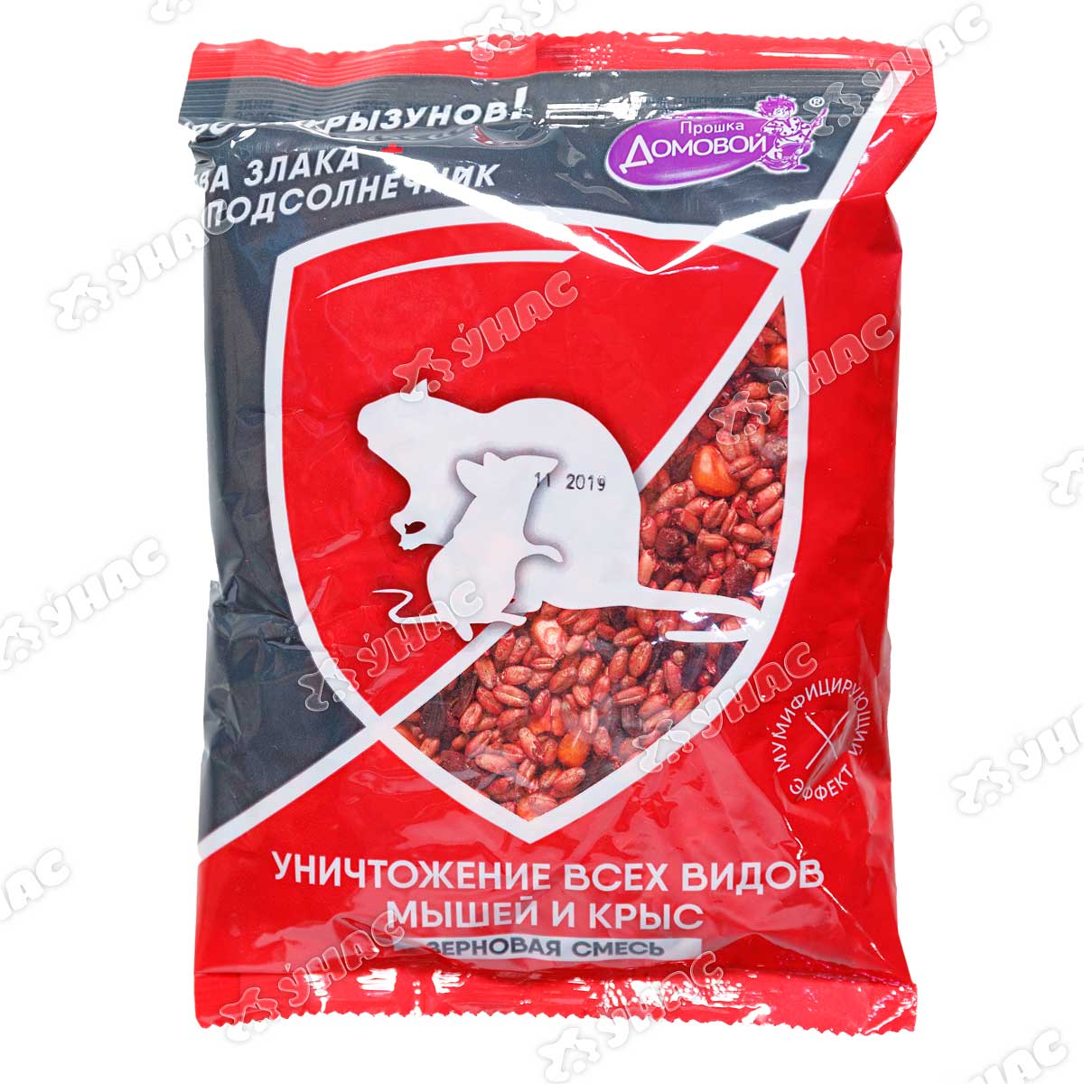 Домовой Прошка Гроза грызунов – готовая к применению зерновая приманка для уничтожения домовых мышей, полевок и других мышевидных грызунов, а также серых и черных крыс. Применяется на объектах различных категорий, включая пищевые, лечебные, детские учреждения (за исключением спален, игровых комнат, столовых). Приманка содержит горькую добавку «битрекс», предотвращающую случайное съедение приманки человеком или домашними животными (кроме грызунов). В качестве действующего вещества используется – бромадиолон. Бромадиолон – это родентицид, из класса антикоагулянтов, имеет отсроченный срок действия. Вещество, попадая в организм грызуна, замедляет синтез протромбина в печени. Это приводит к снижению свертываемости крови и истончению стенок кровеносных сосудов. Гибель грызунов наступает на 4-12 день с момента поедания приманки. Состав: бромадиолон (0,005%), битрекс, краситель, пищевые наполнители.