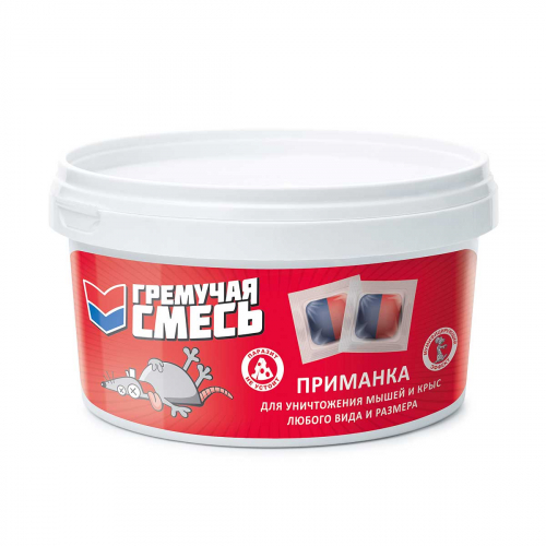 Родентицидное средство Гремучая смесь - это готовая к применению пищевая тестообразная приманка красного и синего цвета в равных долях. Средство обладает высокой родентицидной активностью для крыс и мышей: поедаемость приманки составляет: 49% от суточного рациона крыс, 43% -домовых мышей и 35% - полевок. Гибель крыс наступала на 4-5 день ( 4,3 дн. в среднем), на 5-4 день ( 4, 7 дн. в среднем) - мышей и на 5-4 день (4,5 дн. в среднем) - полевок.