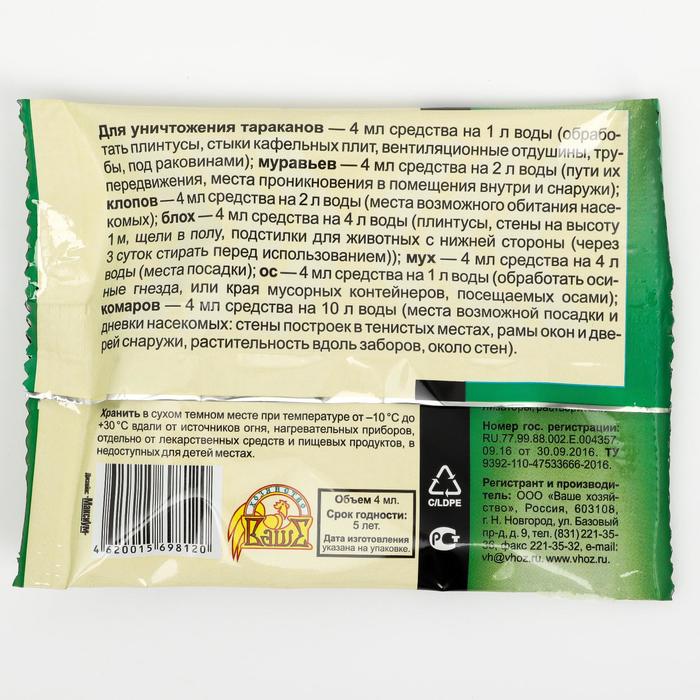Состав: циперметрин — 25%, эмульгаторы, стабилизаторы, растворители.