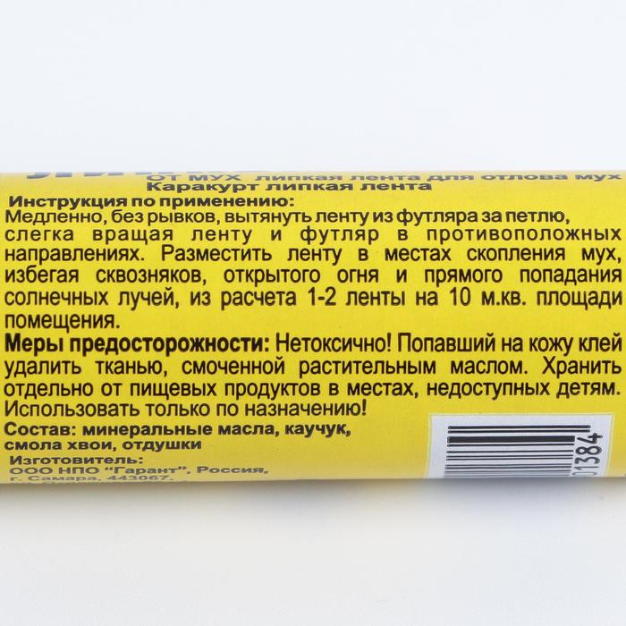 Назначение: Предназначена для уничтожения мух.Характеристика: Инсектицидное средство представляет собой свернутую в спираль бумажную ленту, покрытую с обеих сторон клеевой массой коричневого цвета. Натуральный мед, введенный в состав клея, активно привлекает мух на ленту. Клеевая лента обладает сильным фиксирующим действием, не позволяя мухам оторваться от поверхности. Клеящие свойства сохраняются не менее 1,5-2 месяцев.Способ применения: Перед тем, как извлечь ленту из упаковки, согреть ее в руке.При медленном вращении вытянуть ленту за петлю до конца, оставив при этом картонный футляр внизу ленты, не позволяя ей закручиваться в обратном направлении. Закрепить ленту так, чтобы она висела вертикально. Развешивают лепты в местах наибольшего скопления мух: на кухнях, в местах приготовления или хранения пищи, в кладовых, на верандах. Норма расхода: 1-2 ленты на помещение 10-15 м. Заменяют ленты по мере загрязнения. Липкие ленты не следует развешивать на сквозняках.Меры предосторожности: К клею легко прилипают любые предметы, поэтому все работы следует выполнять в фартуке или халате. Защищать кожу рук резиновыми перчатками, избегать попадания в глаза и на кожу. Беречь от огня, воды и прямых солнечных лучей! Не вешать ленты на сквозняках! После окончания работ (развешивание лент) вымыть руки водой с мылом. Уничтожать липкие ленты сжиганием или выбрасывать в мусоросборники, предварительно завернув в бумагу, чтобы избежать налипания на них нецелевых видов животных. Использовать только по назначению.Состав: каучук синтетический 5%, канифоль или смола сосновая 55%, отдушка 0.5%, масло минеральное 39.5%. Не содержит токсических веществ.