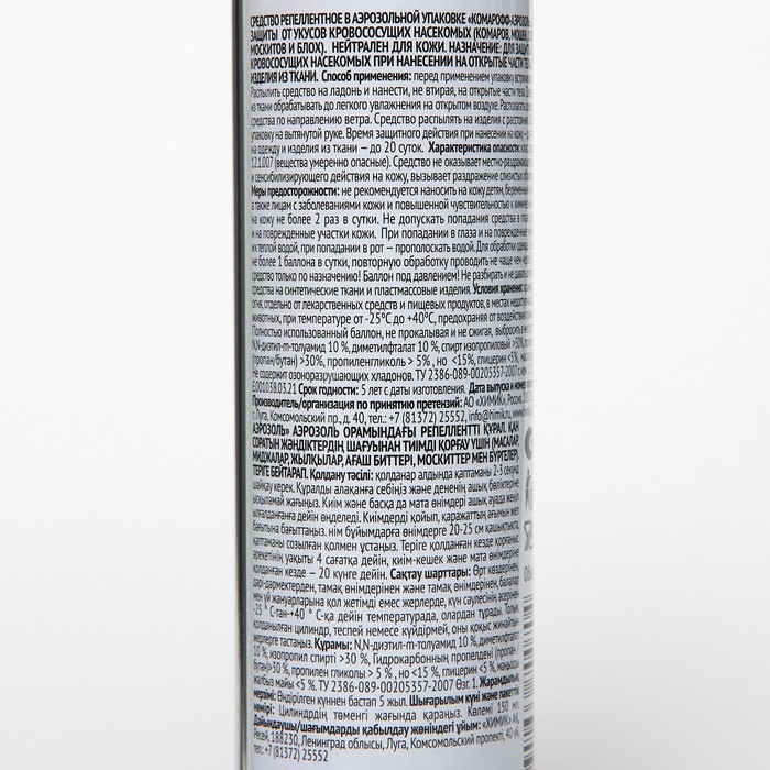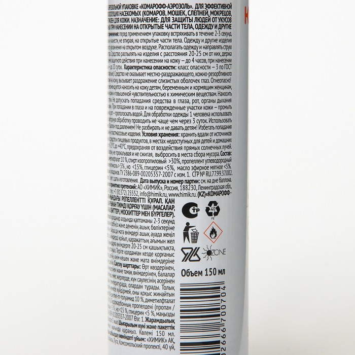 «Комарофф» — это средство для всей семьи по доступной цене. Современные репелленты обладают высоким качеством, совершенно безвредны для людей и моментально уничтожают таких насекомых, как комары, мошки, клещи, слепни, мокрецы. В тёплую погоду они обеспечивают надёжную защиту на срок от 4 до 8 часов.Новые разработки и исследования проводятся каждый год, что позволяет создавать качественную и безопасную продукцию.Аэрозоль предназначен для эффективной защиты от укусов комаров, москитов, слепней и других кровососущих насекомых. Удобно обрабатывать большие поверхности. Следует наносить на открытые части тела, одежду и прочие тканевые изделия. Не оставляет пятен, нейтрален для кожи.Состав: демитилфлатат спирт, изопропиловый пропеллент, углеводородный пропиленгликоль.