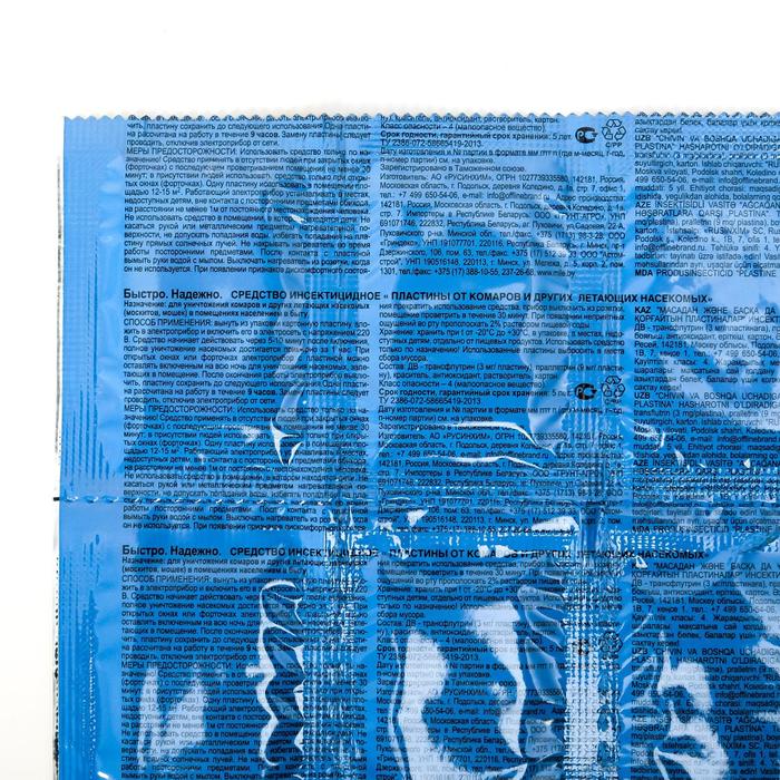 Назначение: для уничтожения комаров и других летающих насекомых (москитов, мошек) в помещениях населением в быту.Способ применения: вынуть из упаковки картонную пластину, вложить в электроприбор и включить его в электросеть с напряжением 220 В. Средство начинает действовать через 5-10 минут после включения, полное уничтожение насекомых достигается примерно за 1 час. При открытых окнах или форточках электроприбор с пластиной можно оставлять включенным на всю ночь для уничтожения насекомых, залетающих в помещение. После окончания работы электроприбор выключить, пластину сохранить до следующего использования. Одна пластина рассчитана на работу в течение 9 часов. Замену пластину следует проводить, отключив электроприбор от сети.Меры предосторожности: использовать средство только по назначению. Средство применять в отсутствии людей при закрытых окнах (форточках) с последующим проветриванием помещения не менее 30 минут; в присутствии людей использовать средство только при открытых окнах (форточках). Одну пластину использовать в помещении площадью 12-15 м2. Работающий электроприбор устанавливать в местах, недоступных детям, вне контакта с посторонними предметами обихода, на расстоянии не менее 1м от постоянного местонахождения человека. Не использовать средство в помещении, в котором находятся дети. Не касаться рукой или металлическим предметом нагревательной поверхности, не допускать попадания воды, избегать попадания на пластину прямых солнечных лучей. Не накрывать нагреватель во время работы посторонними предметами. После контакта с пластиной вымыть руки водой с мылом. Выключать нагреватель из розетки, когда он не используется. При появлении признаков дискомфортного состояния прекратить использование средства, прибор выключить из розетки, помещение проветрить в течение 30 минут. При появлении неприятных ощущений во рту прополоскать 2% раствором пищевой соды.Хранение: хранить при температуре от -20°С до +30°С, в упаковке, в местах, недоступных детям, отдельно от пищевых продуктов. Использовать средство только по назначению. Использованные пластины выбросить в места сбора мусора. Состав: трансфлутрин (3 мг/ пластину), праллетрин (9 мг/ пластину), краситель, антиоксидант, растворитель, картонная основа.Срок годности, гарантийный срок хранения: 5 лет.