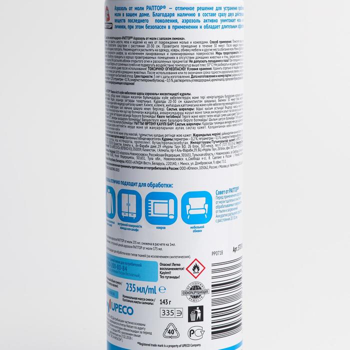 Аэрозоль от насекомых «Раптор», от моли, спрей, с запахом лимона, 235 мл