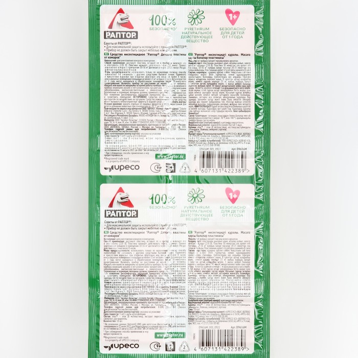 Принцип действия пластин Раптор® очень прост: при включении фумигатора в электросеть происходит постепенное нагревание пластины от керамического нагревательного элемента прибора, в результате чего начинается процесс равномерного испарения действующего вещества в воздух. В воздухе частицы попадают на пролетающих насекомых (комаров или мух) и проникают в них через систему дыхания, начиная свое воздействие.Pyrethrum (пиретрум) – природный инсектицид. Пиретрум получают из нескольких видов горной ромашки. Это один из старейших инсектицидов растительного происхождения, который по быстроте действия на насекомых и безвредности для человека является непревзойденным. Etoc® (эток) – высокоэффективное вещество, формула которого была разработана в Японии. На насекомых эток и пиретрум действуют как сильное нервнопаралитическое средство.Сочетание этих двух действующих веществ обеспечивают бережную и эффективную защиту от комаров.Одна пластина рассчитана на 8 часов спокойного сна вашего ребенка.Без запаха.В одной упаковке 10 пластин.В составе натуральный экстракт особого вида ромашки - pyrethrum (пиретрум).Эффективность подтверждена НИИД Роспотребнадзора РФ и тестами итальянских производителей.