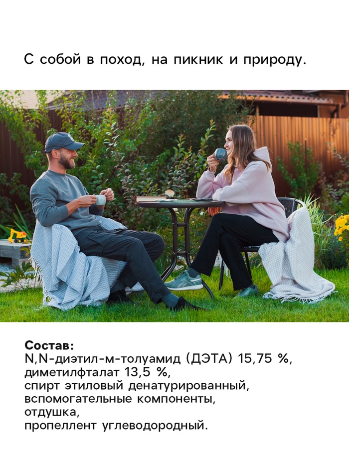 "Репеллент ""Леший"" разработан для обеспечения надежной защиты от укусов клещей и других кровососущих насекомых. При использовании средства на коже обеспечивается защита на срок до 4 часов, а при обработке одежды эффект увеличивается до 5 суток против клещей и до 30 суток против остальных насекомых.Специальный состав репеллента, включающий альфациперметрин и имипротрин, успешно отпугивает насекомых, не вызывая при этом сильного отторжения у людей благодаря приятному ванильному аромату.Помимо высокой эффективности, средство удобно в использовании благодаря форме выпуска в виде аэрозоля, что позволяет равномерно распределить его на поверхности кожи и одежды."Состав:N,N-диэтил-м-толуамид (ДЭТА) 15,75%,диметилфталат 13,5%,бутан/пропан/изобутан смесь >30%,спирт этиловый денатурированный 15-30%,глицерин