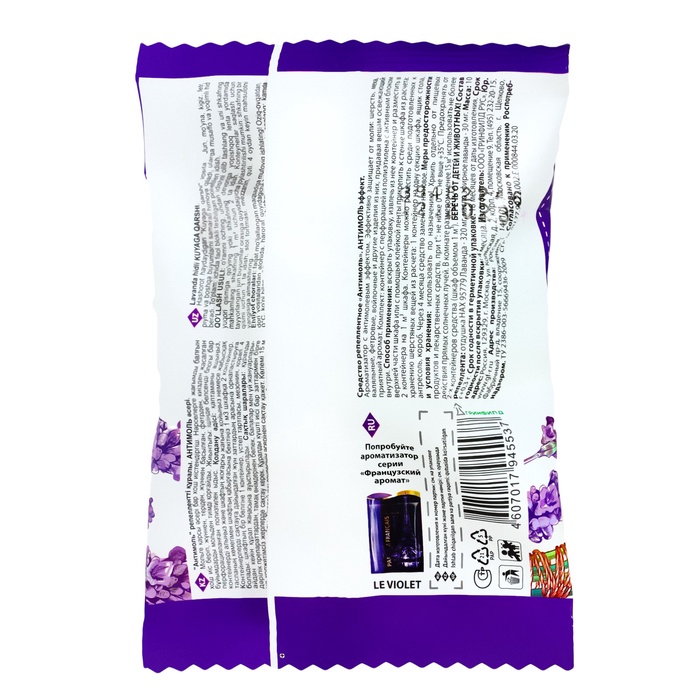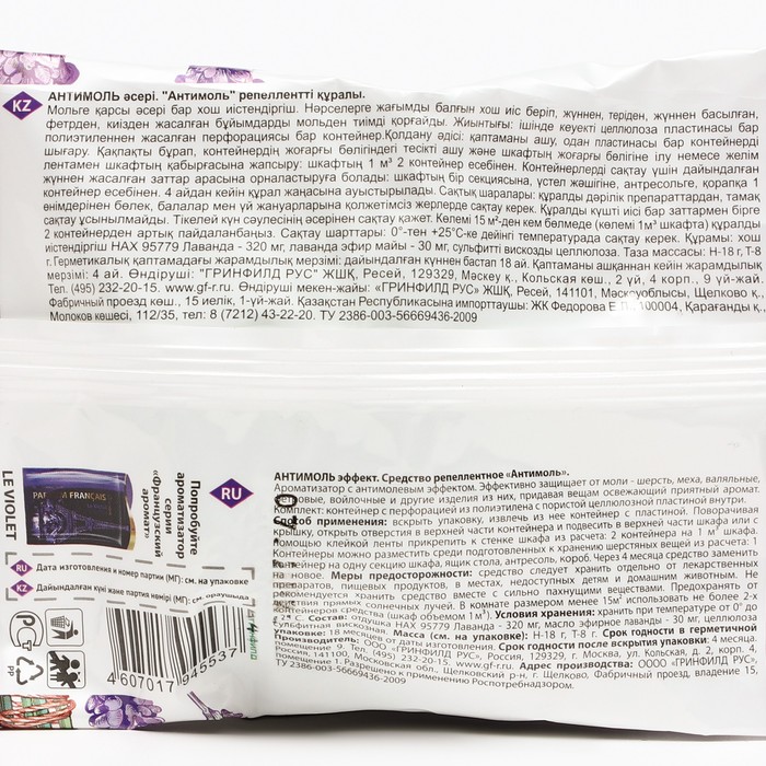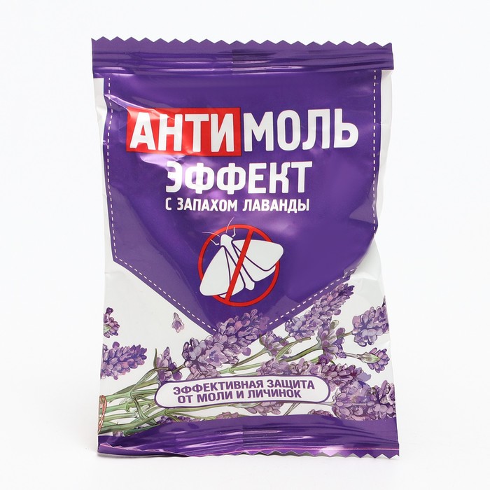 Эффект-Антимоль средство от моли - репеллентное средство-ароматизатор с антимолевым эффектом. Эффективно защищает от моли шерсть, меха, валяльные, фетровые, войлочные и другие изделия, придавая вещам освежающий приятный аромат.Способ применения: вскрыть упаковку, извлечь из нее контейнер с пластиной. Поворачивая крышку, открыть отверстия в верхней части контейнера и подвесить в верхней части шкафа или с помощью клейкой ленты прикрепить к стенке шкафа из расчета: 2 контейнера на 1 м³ шкафа. Контейнеры можно разместить среди подготовленных к хранению шерстяных вещей из расчета: 1 контейнер на одну секцию шкафа, ящик стола, антресоль, короб. Через 4 месяца средство заменить на новое.Хранить отдельно от пищевых продуктов в местах не доступных детям и домашним животным! В комнате размером менее 15м² использовать не более 2-х контейнеров средства (шкаф объемом 1м3). Состав: Отдушка Лаванда, масло эфирное лаванды, целюлоза сульфитная вискозная.