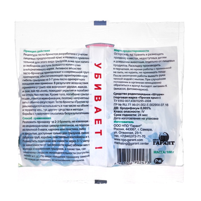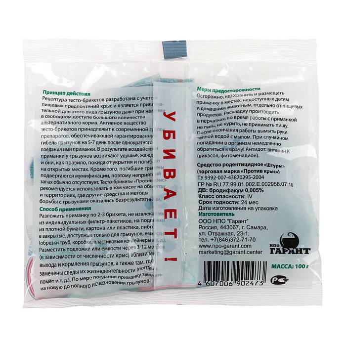 Норма раскладки: по 1 брикету — для уничтожения мышей, 1-3 брикета — для уничтожения крыс. Расстояние между местами раскладки — 5-10 м.
