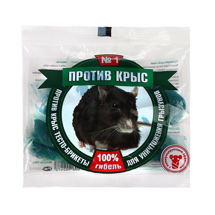 Тесто-брикет от крыс  — универсальное средство для борьбы с разными видами грызунов. Представляет собой привлекательную для грызунов приманку, после однократного поедания которой они погибают. Действующее вещество — 0,005% антикоагулянта бродифакума. Для уничтожения достаточно разложить приманку в нескольких местах. Вес одного брикета — 200 г.