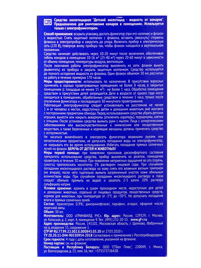 Детская жидкость для фумигатора обеспечивает защиту от комаров на протяжении 20 ночей. Специально разработанный состав подходит для использования в комнатах, где спят дети.