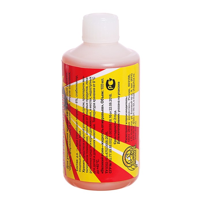 Применение: для уничтожения муравьев приманку наливают в непищевые подложки (напр. полиэтиленовые крышки) по 10–20 мл на каждую. Срок действия средства не менее 1,5 месяцев, или до полного высыхания.