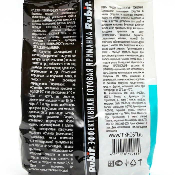 * Приманка не вызывает отпугивающего действия и настороженности других особей, т.к. гибель грызунов происходит через 3-6 суток после поедания брикетов.