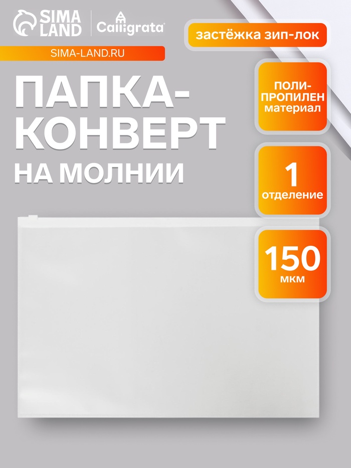 Папка-конверт на ZIP-молнии A4, 150 мкм, Calligrata, прозрачная, белая молния