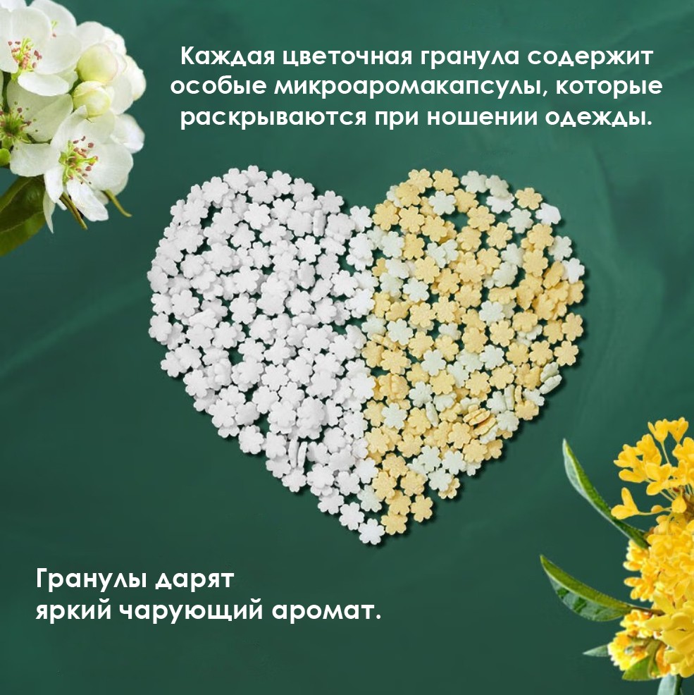 Каждая гранула содержит особые микроаромакапсулы, которые раскрываются во время соприкосновения волокон ткани при использовании белья или ношении одежды и дарят яркий чарующий аромат.