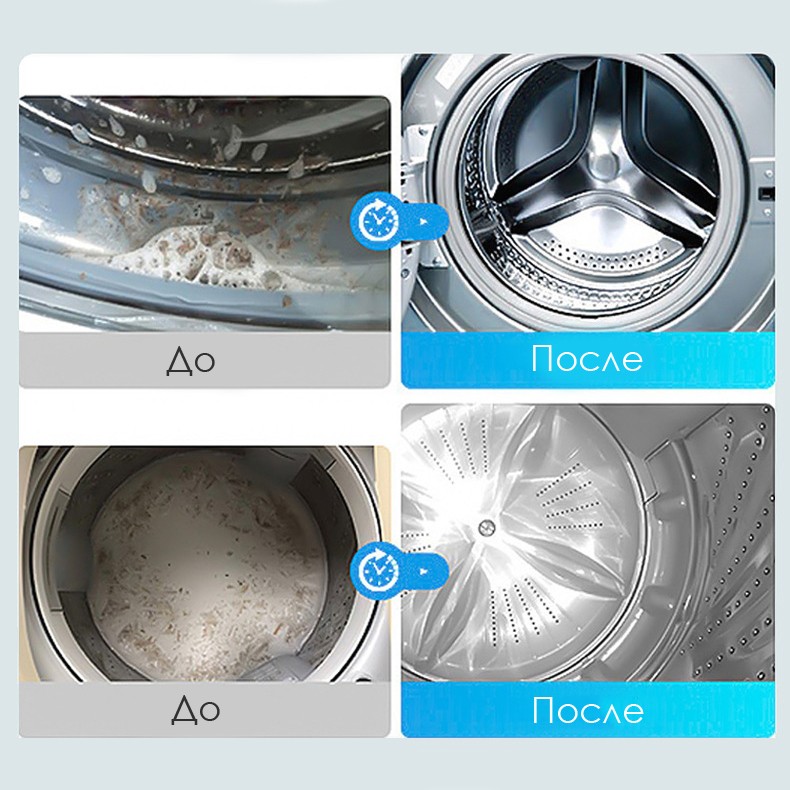 Очиститель стиральной машины обеспечивает эффективную чистку барабана и резиновой манжеты, справляясь с загрязнениями внутри техники.