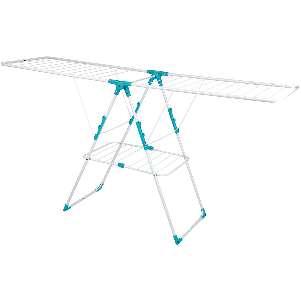 Как на фото Удобная складная сушилка с полкой Преимущества: поперечное расположение сушильных прутьев на распашных створках  стальные струны с антикоррозийным покрытием пластмассовые наконечники на опорах подходит для использования в любых помещениях и на открытом воздухе сушилка компактна в сложенном состоянии и вместительна в развернутом длина сушильного полотна 21м максимальная нагрузка не более 15 кг Габаритные размеры: в разложенном виде (ДхШхВ): 1815х515х930мм  в сложенном виде (ДхШхВ): 1005х515х70мм Вес:  4,22кг