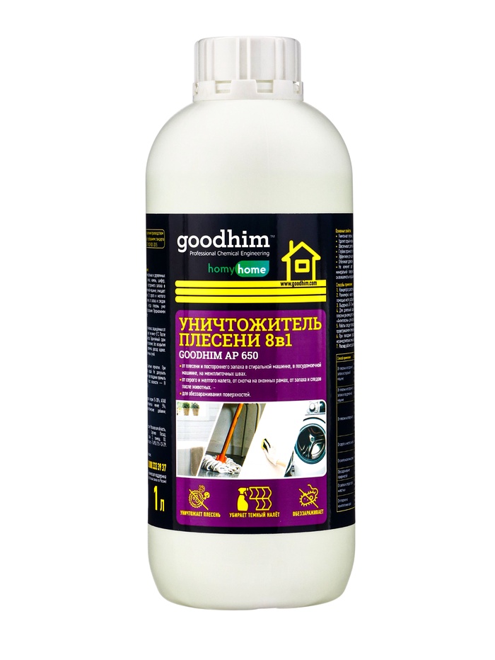 Уничтожитель плесени 8 в 1 Goodhim, очиститель межплиточных швов, 1 л – профессиональное средство для комплексной борьбы с плесенью, грибком и загрязнениями на различных поверхностях. Особенно эффективно для обработки межплиточных швов, где чаще всего скапливается влага и появляется чёрный налёт. Средство глубоко проникает в структуру материала, уничтожает споры плесени и препятствует их повторному появлению.