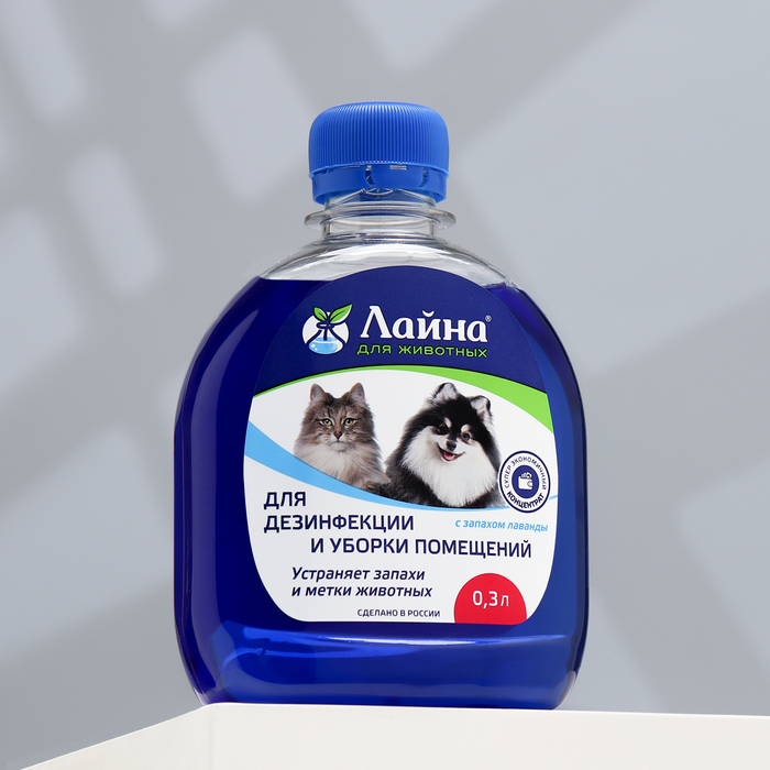 Универсальное дезинфицирующее средство "Лайна" 300 мл.Универсальное дезинфицирующее средство Лайна обеззараживает, дезодорирует и моет зоны и поверхности, где обитают животные, и предметы за ними. Свойства: уничтожает возбудителей кишечных, гнойных, грибковых, аденовирусных инфекций; обладает отличными моющими свойствами; устраняет неприятные запахи; не портит поверхности и ткани. Для устранения неприятного запаха и меток животных участки пола и коврового покрытия очищают, затем обрабатывают губкой, смоченной в растворе. Состав: полисепт, ЧАС, комплекс ПАВ, целевые добавки, вода. Внимание! Средство не рекомендуется смешивать с бытовыми моющими средствами. После обработки поверхностей не требуется смывание водой и проветривание.
