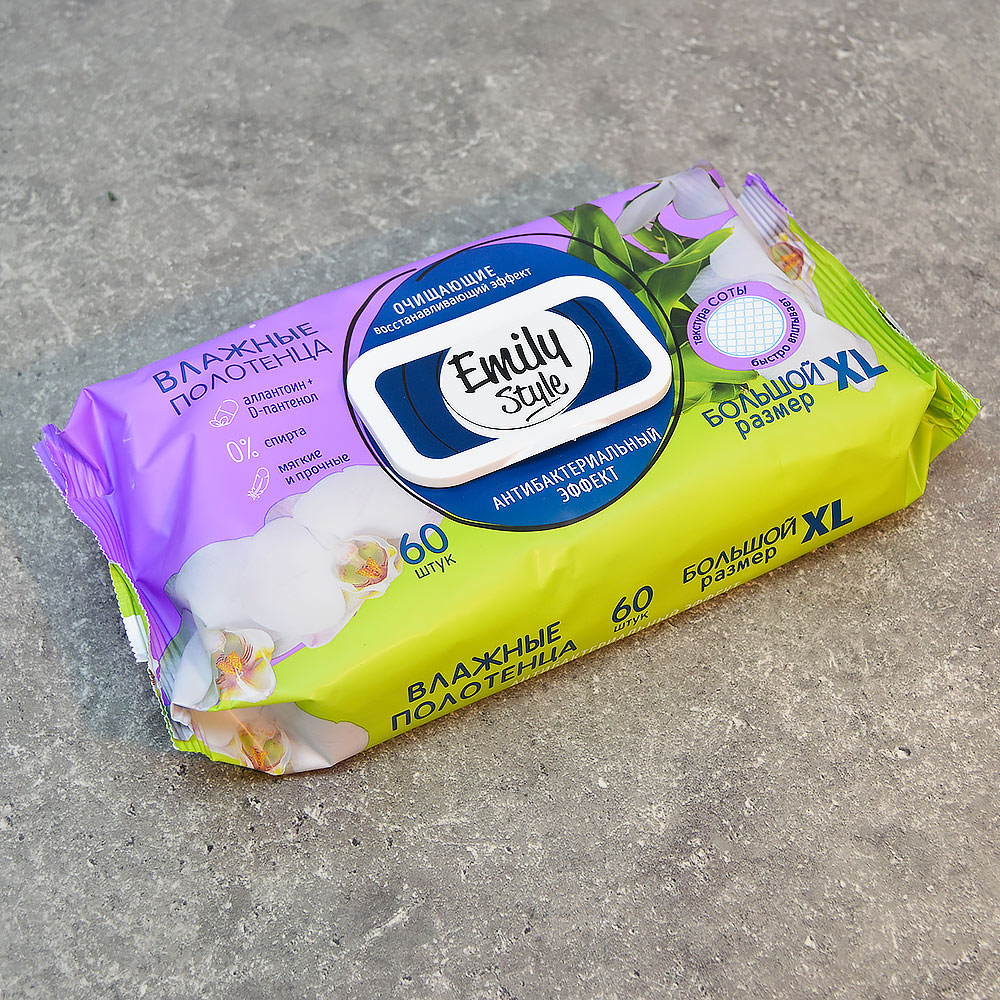 Влажные полотенца для всей семьи 60шт "Антибактериальные" с крышкой, XL размер, Emily Style