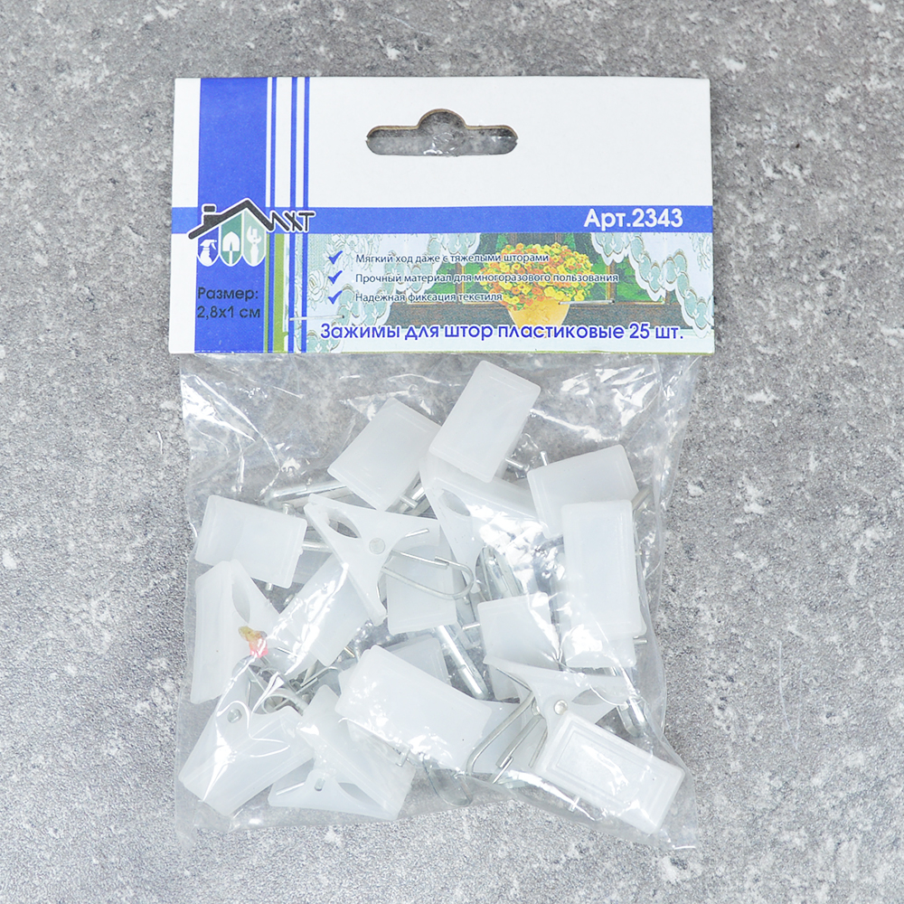 Зажим для штор без кольца 25шт пластиковыеЗажим позволяет закрепить шторы. Конструкция прочно сцепит ткань, но не повредит её, выдержит даже тяжёлый текстиль и останется незаметным.В упаковке 25 шт.Заключаем договора по 44 ФЗ, 223 ФЗ