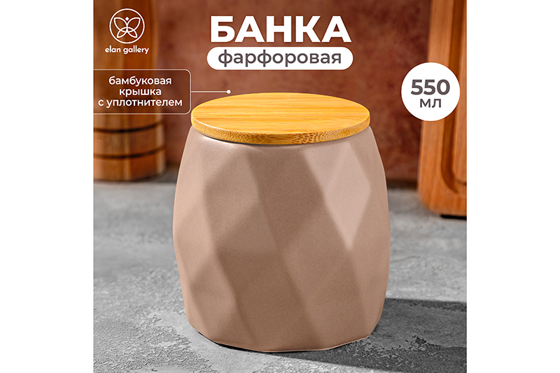 Банка от Elan Gallery предназначена для организации хранения продуктов на вашей кухне. Размер ёмкости – 10,5х10,5х10,5 см, объём – 550 мл. Выполнена из высококачественного фарфора. Он не впитывает цвет продуктов и легко отмывается, благодаря чему надолго сохранит свой привлекательный вид. Поверхность имеет необычный гранёный рельеф и цвет капучино. Крышка выполнена из натурального бамбука и оснащена силиконовым уплотнителем. Изделие отлично подойдёт для хранения сыпучих продуктов: сахара и соли, чая и кофе, приправ и специй. Храните в баночке ягоды, орехи и сухофрукты. Заполните её леденцами, конфетами или небольшим печеньем. Подайте баночку к столу, чтобы идеально дополнить чайную сервировку! Герметичная деревянная крышка защитит ваши продукты от попадания грязи и пыли. Баночка тёплого цвета капучино впишется в любой интерьер и позволит организовать хранение даже на открытых полках. Не рекомендуется применять абразивные моющие средства. Без крышки подходит для использования в микроволновой печи и посудомоечной машине. Бамбук нельзя замачивать! Поставляется в дизайнерской картонной коробке – благодаря ей вам не потребуется дополнительная подарочная упаковка. Это идеальный подарок для хозяйки, ценящей не только практичность, но и стиль. В ассортименте бренда Элан Галерея представлены банки для хранения на любой вкус. Соберите целый набор для эстетичного хранения продуктов на вашей кухне! /
