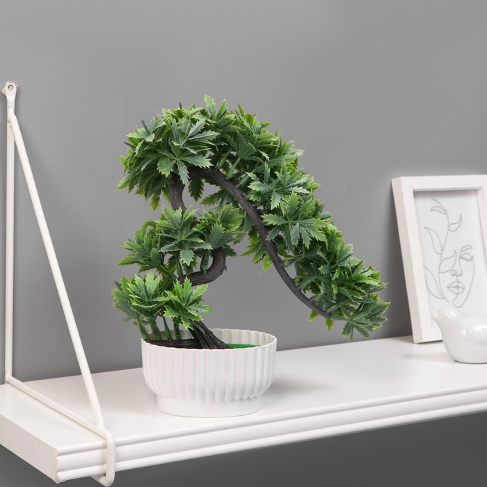 Этот искусственный бонсай служит отличной альтернативой живым растениям, позволяя создать природную атмосферу без хлопот. Он помогает оживить пространство, добавляя зелень и уют. Такой элемент подойдет для тех, кто ценит эстетику и практичность в домашнем или офисном декоре.