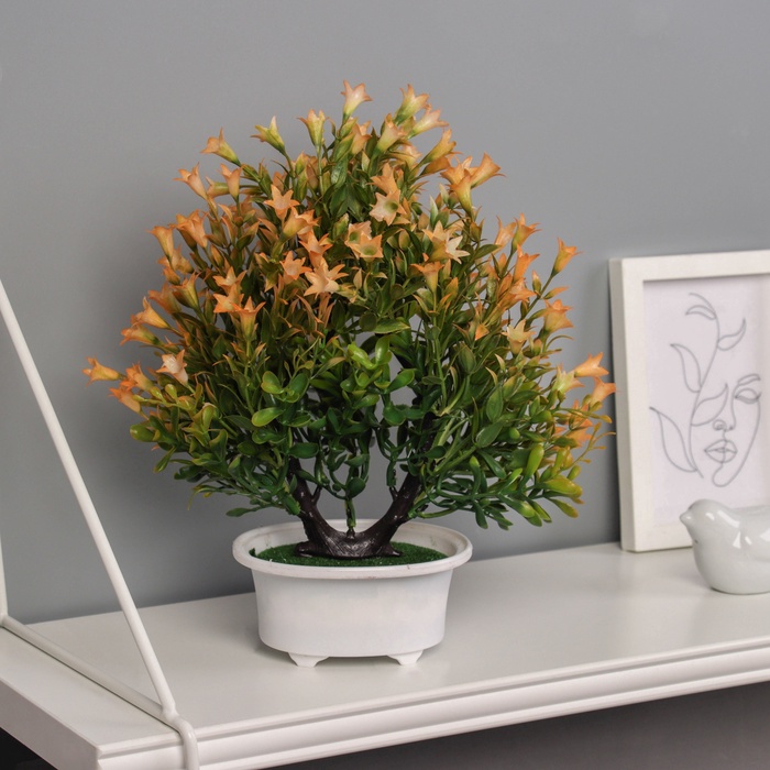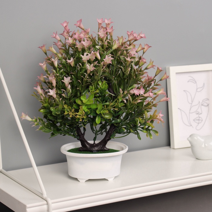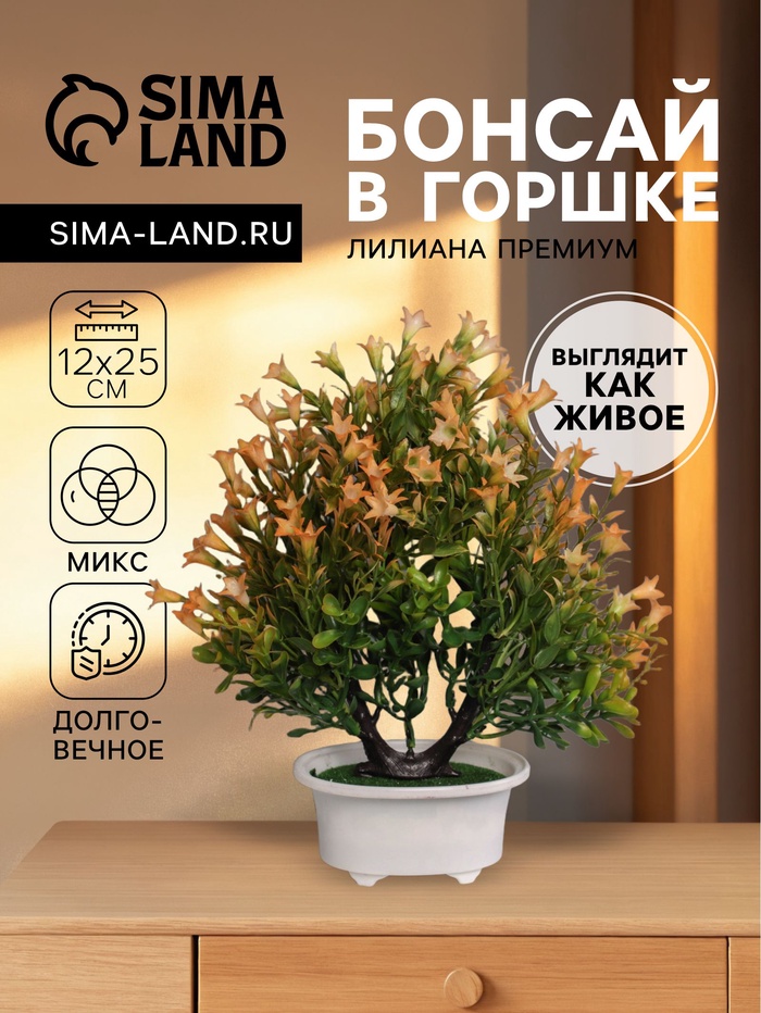 * Искусственный материал: Использование качественных материалов обеспечивает долговечность и яркость цветов. Бонсай не требует полива, освещения или особого ухода.