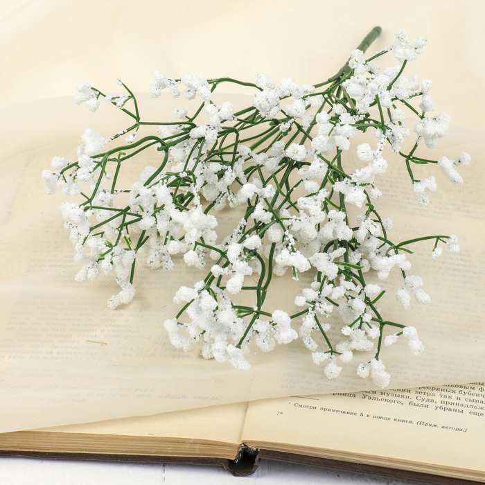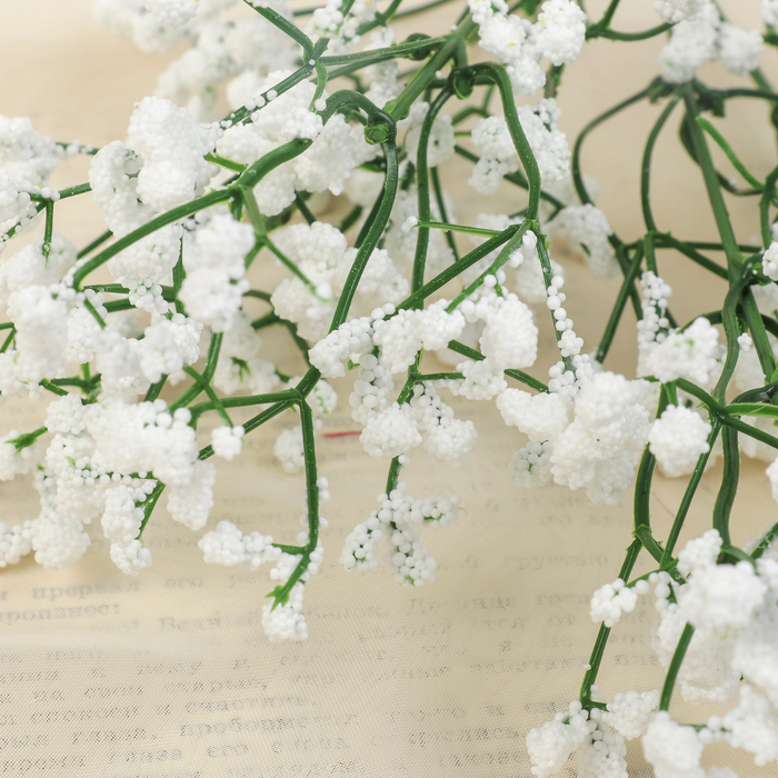 Белоснежные искусственные веточки гипсофилы добавят воздушности и нежности в любой интерьер. Их пластиковые стебли и цветы сохраняют идеальную форму, не требуя ухода. Композиция высотой 33 см подходит для украшения дома, свадебного декора или создания уютной атмосферы в кафе.