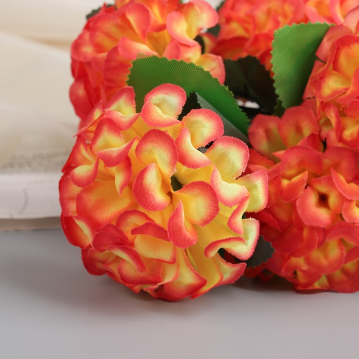 * Натуралистичный внешний вид: Текстильные соцветия и листья точно передают структуру живого цветка. Лепестки гортензии имеют плавные цветовые переходы, а зелень дополняет общую композицию, создавая эффект только что срезанного растения.