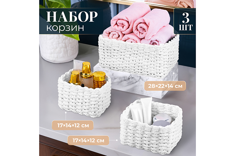 БЫЛО 1080 руб! Набор 3 плетеных корзин, 1 корзинка 28*22*14,5 см, 2 корзинки 17*14*12 см, белый