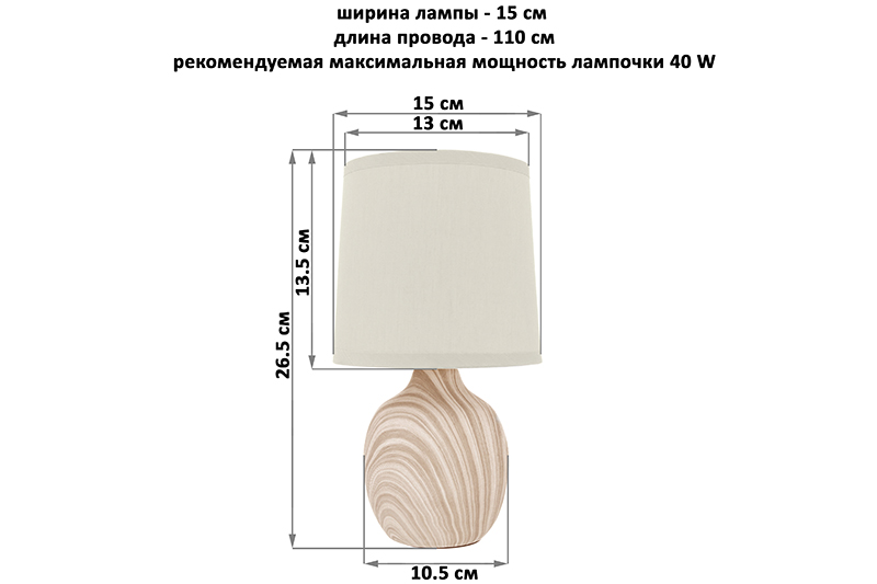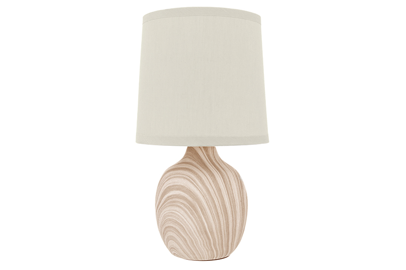 Настольная лампа с абажуром от Elan Gallery "Мраморная" — это не только дополнительный источник света, но и стильное украшение интерьера спальни или гостиной. Размер – 15х15х26,5 см. Цоколь Е14. Фигурное основание выполнено из керамики, покрыто рисунком в виде дугообразных полос. Размеры абажура: диаметр по верху 13 см, диаметр по низу 15 см, высота 13,5 см. Рекомендуется использовать лампочку мощностью не более 40 W (в комплект не входит). Работает от сети, необходимо наличие розетки. Выключатель расположен на проводе длиной 110 см. Имеет стильный дизайн и компактный размер. Маленький декоративный светильник поможет создать уютную атмосферу в комнате или на кухне. Он подходит для использования в качестве ночника, а также прикроватного светильника. Станет отличным предметом декора для вашего комода или журнального столика. Прекрасно впишется в интерьер детской комнаты, создавая уютную атмосферу для школьника. Можно поставить на туалетный столик возле кровати для спокойного чтения книг перед сном. На даче небольшой ночной светильник поможет создать приятную атмосферу на террасе или в доме. Поставьте красивую лампу на стол или тумбочку, чтобы организовать дополнительную подсветку в любом пространстве. Фигурная настольная лампа станет приятным подарком на любой праздник как взрослым, так и детям. Не рекомендуется использовать абразивные моющие средства. Светильник с керамическим основанием — это не просто источник освещения, он украсит интерьер вашего дома и поможет создать уютную атмосферу! В ассортименте Elan Gallery представлено много товаров и предметов декора, которые позволят создать уголок гармонии для комфортного отдыха дома.