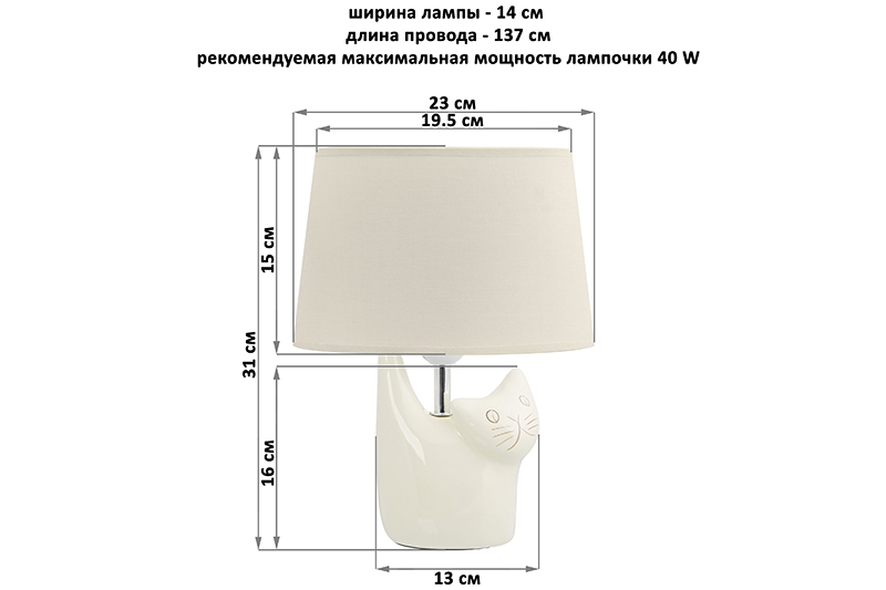 Настольная лампа "Кот" с абажуром кремового цвета овальной формы от Elan Gallery — это не только дополнительный источник света, но и стильное украшение интерьера спальни или гостиной. Размер – 23х14х31 см. Цоколь Е27. Основание выполнено из керамики. Размеры абажура: нижняя часть 23х14 см, верхняя часть 19,5х11,5 см, высота 15 см. Рекомендуется использовать лампочку мощностью не более 40 W (в комплект не входит). Работает от сети, необходимо наличие розетки. Выключатель расположен на проводе длиной 137 см. Имеет оригинальный дизайн: керамическое основание выполнено в виде фигурки котика. Декоративный светильник поможет создать уютную атмосферу в комнате или на кухне. Он подходит для использования в качестве ночника, а также прикроватного светильника. Станет отличным предметом декора для вашего комода или журнального столика. Лампа прекрасно впишется в интерьер детской комнаты, создавая уютную атмосферу для школьника. Можно поставить на туалетный столик возле кровати для спокойного чтения книг перед сном. На даче ночной светильник поможет создать приятную атмосферу на террасе или в доме. Поставьте красивую лампу на стол или тумбочку, чтобы создать дополнительную подсветку в любом пространстве. Фигурная настольная лампа станет приятным подарком на любой праздник как взрослым, так и детям. Не рекомендуется использовать абразивные моющие средства. Светильник с керамическим основанием и кремовым абажуром — это не просто источник освещения, он украсит интерьер вашего дома и поможет создать уютную атмосферу! В ассортименте Elan Gallery представлено много товаров и предметов декора, которые позволят создать уголок гармонии для комфортного отдыха дома.