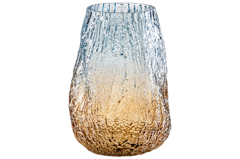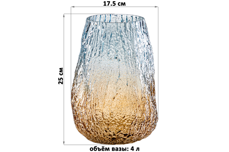 Интерьерная ваза ручной выдувки размером 17,5х17,5х25 см и объемом 4 литра выполнена из прочного стекла, окрашена градиентом в бежевом и голубом цвете. Стеклянная вазочка подойдет для размещения букетов, искусственных цветов или сухоцветов. Прозрачная ваза послужит стильным элементом декора для вашего дома. Поставьте в нее цветы и оригинальная форма вазы изящно подчеркнет красоту букета. Интерьерная ваза украсит комнату даже при использовании без наполнения. Разместите ее на столе или полке, чтобы создать в комнате стильный акцент. Декоративная вазочка поставляется в прочной картонной упаковке. Красивая ваза сможет стать настоящим украшением дома, или оригинальным подарком для мамы и сестры.
