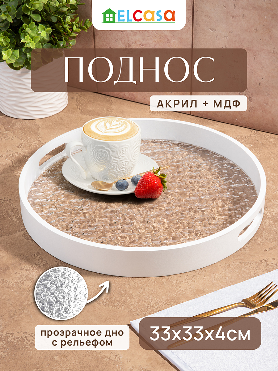 Круглый поднос с ручками от бренда ELCASA размером 33,5х33,5х4 см имеет прозрачное дно из акрила. Белые бортики выполнены из МДФ. Дно украшено декоративным рельефом. Изделие подойдет для подачи блюд в разные комнаты и сервировки обеденного стола, а также украшения интерьера декоративными композициями. В спальне на подносе можно хранить косметику или журналы, поставив его на стол. Проведите уютный вечер на веранде с вином и фруктами, чайную церемонию с друзьями или устройте завтрак в постель. Благодаря ручкам удобен для переноса посуды. Поднос можно использовать как подставку для предметов декора. Создавайте красивые декоративные композиции со свечами, цветами и интерьерными аксессуарами. Многофункциональный поднос можно использовать для организации хранения. Разместите на кухне чай, кофе, специи и различную утварь. В спальне подойдёт для парфюмерии и косметических принадлежностей, а в прихожей под любые мелочи. Не рекомендуется применять абразивные моющие средства. В коллекции бренда ЭЛЬКАСА представлено много красивой посуды и стильных товаров для дома, выберите варианты на свой вкус!
