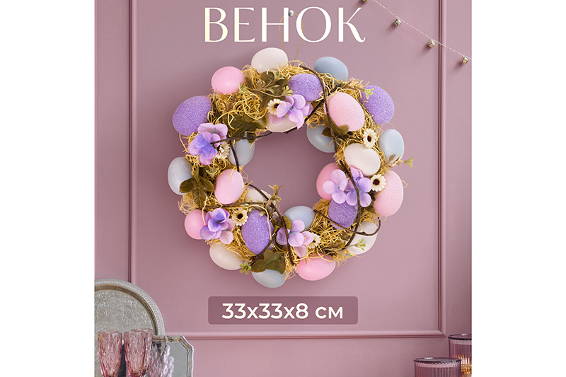 Венок «Сиреневое очарование» от Elan Gallery станет изящным дополнением вашего интерьера. Размер изделия – 33х33х8,5 см. Представляет собой композицию из декоративных веточек, цветочков и разноцветных яиц, в том числе с эффектом «сахарного» напыления. Светлая Пасха – один из главных праздников весны! Мы разработали коллекцию сезонных товаров для дома, которые помогут создать радостную и уютную атмосферу в квартире или на даче. Пасхальный декор преобразит домашний интерьер и поможет встретить праздник в кругу любимых. Изделие имеет петельку из верёвочки, благодаря которой его удобно разместить на двери или стене для декорирования домашнего интерьера. Повесьте венок на дверь, шкаф и любую другую свободную вешалку, чтобы он всегда был на виду и радовал глаз. Сделайте его частью праздничного стола, чтобы привнести в дом ощущение чуда. Задействуйте в тематическом оформлении с фигурками, статуэтками и другими украшениями. Посадите в его центр пасхальных зверьков: зайчиков, курочек и цыплят. Необычный элемент декора найдёт место в любой части вашей квартиры – в прихожей, гостиной, столовой или спальне. Это изящный и лёгкий способ добавить эстетики любому помещению. В коллекции бренда Элан Галерея вы найдёте множество как ярких, так и нежных декоративных украшений – каждый обязательно подберёт сувенир на свой вкус. Они станут чудесным подарком для родных, близких и коллег. Наполните пространство вокруг себя радостью и весенним настроением!