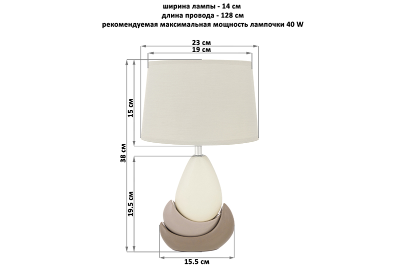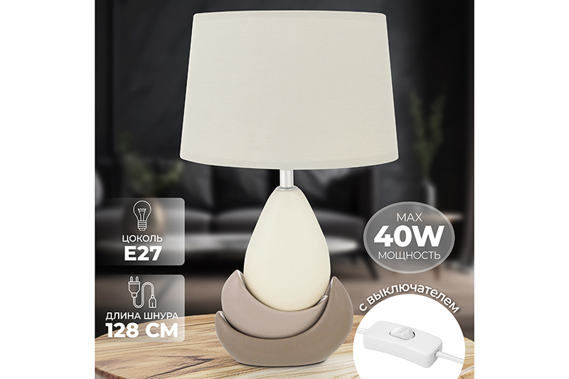 Настольная лампа с абажуром от Elan Gallery "Бархан" — это не только дополнительный источник света, но и стильное украшение интерьера спальни или гостиной. Размер – 23х14х38 см. Цоколь Е27. Фигурное основание выполнено из керамики. Размеры абажура: по верху 19х11,5 см, по низу 23х14 см, высота 15 см. Рекомендуется использовать лампочку мощностью не более 40 W (в комплект не входит). Работает от сети, необходимо наличие розетки. Выключатель расположен на проводе длиной 128 см. Благодаря стильному дизайну добавит элегантности вашему интерьеру! Декоративный светильник поможет создать уютную атмосферу в комнате или на кухне. Он подходит для использования в качестве ночника, а также прикроватного светильника. Станет отличным предметом декора для вашего комода или журнального столика. Прекрасно впишется в интерьер детской комнаты, создавая уютную атмосферу для школьника. Можно поставить на туалетный столик возле кровати для спокойного чтения книг перед сном. На даче небольшой ночной светильник поможет создать приятную атмосферу на террасе или в доме. Поставьте красивую лампу на стол или тумбочку, чтобы организовать дополнительную подсветку в любом пространстве. Фигурная настольная лампа станет приятным подарком на любой праздник как взрослым, так и детям. Не рекомендуется использовать абразивные моющие средства. Светильник с керамическим основанием — это не просто источник освещения, он украсит интерьер вашего дома и поможет создать уютную атмосферу! В ассортименте Elan Gallery представлено много товаров и предметов декора, которые позволят создать уголок гармонии для комфортного отдыха дома.