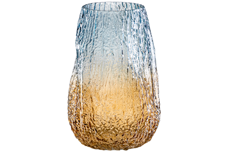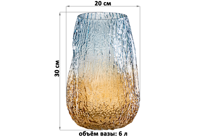 Интерьерная ваза ручной выдувки размером 20х20х30 см и объемом 6 литров выполнена из прочного стекла, окрашена градиентом в бежевом и голубом цвете. Высокая ваза подойдет для размещения букетов, искусственных цветов или сухоцветов. Эргономичная форма большой вазы подходит для цветов с длинными стеблями. Стеклянная ваза послужит стильным элементом декора для вашего дома. Поставьте в нее цветы и вазочка изящно подчеркнет красоту букета. Интерьерная ваза украсит комнату даже при использовании без наполнения. Разместите ее на столе или полке, чтобы создать в комнате стильный акцент. Декоративная ваза поставляется в прочной картонной упаковке. Красивая вазочка сможет стать настоящим украшением дома, или оригинальным подарком для мамы и сестры.