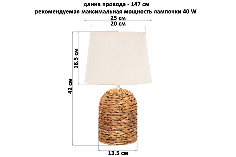 Настольная лампа с бежевым абажуром от Elan Gallery — это не только дополнительный источник света, но и стильное украшение интерьера спальни или гостиной. Размер – 25х25х42 см. Цоколь Е27. Основание выполнено из высушенных стеблей и листьев водного гиацинта. Этот материал не выгорает на солнце, прочен и экологичен. Диаметр нижней части подставки 13,5 см. Размеры абажура: диаметр по верху 20 см, диаметр по низу 25 см, высота 18,5 см. Рекомендуется использовать лампочку мощностью не более 40 W (в комплект не входит). Работает от сети, необходимо наличие розетки. Выключатель расположен на проводе длиной 147 см. Имеет стильный дизайн: плетёное основание из природного материала добавит гармонии природы домашнему пространству! Декоративный светильник поможет создать уютную атмосферу в комнате или на кухне. Он подходит для использования в качестве ночника, а также прикроватного светильника. Станет отличным предметом декора для вашего комода или журнального столика. Лампа прекрасно впишется в интерьер детской комнаты, создавая уютную атмосферу для школьника. Можно поставить на туалетный столик возле кровати для спокойного чтения книг перед сном. На даче ночной светильник поможет создать приятную атмосферу на террасе или в доме. Поставьте красивую лампу на стол или тумбочку, чтобы создать дополнительную подсветку в любом пространстве. Фигурная настольная лампа станет приятным подарком на любой праздник как взрослым, так и детям. Не рекомендуется использовать абразивные моющие средства. Светильник с основанием из экологичного материала — это не просто источник освещения, он украсит интерьер вашего дома и поможет создать уютную атмосферу! В ассортименте Elan Gallery представлено много товаров и предметов декора, которые позволят создать уголок гармонии для комфортного отдыха дома.