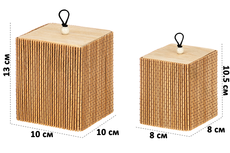 Набор 2 квадратных ёмкостей для хранения размерами 10х10х13 см и 8х8х10,5 см от бренда ELCASA изготовлен из натурального бамбука. Обратите внимание при получении заказа: комплектация полная, контейнер поменьше поставляется внутри контейнера побольше. Имеют ручки в виде петелек и бамбуковые крышки. Размер банок без крышек 10х10х12 см и 8х8х9,5 см. Натуральный цвет изделий и экологичный материал в составе подчеркивают органичность и гармонию с окружающей средой. Стенки каждого изделия выполнены из бамбуковых палочек. Органайзер можно использовать для хранения любых мелочей на столе или комоде: украшений и заколок, резинок для волос и бижутерии. Бамбуковые шкатулки подойдут не только для хранения, но и украсят домашний интерьер как предмет декора. Внутри маленькой коробки можно хранить нитки, иголки и другие швейные принадлежности. В такой шкатулочке серьги, кольца, цепочки и другие ювелирные изделия будут под рукой и не потеряются. В ванной на полке в баночках можно хранить ватные диски, палочки и другие гигиенические принадлежности. Сундучок позволит держать под рукой мелкую канцелярию и предметы для шитья. Не рекомендуется применять абразивные моющие средства. Бамбук нельзя замачивать! Комплект интерьерных коробочек станет приятным подарком на любой праздник и позволит держать мелкие аксессуары под рукой. Сделайте сюрприз своим близким, эстетичные ёмкости пригодятся любой женщине. Используйте маленький бокс для хранения любых вещей на свое усмотрение. Комплект небольших декоративных ёмкостей украсит полочку, туалетный столик и поможет создать порядок в любом пространстве! В коллекции бренда ELCASA представлено много стильных товаров для дома, выберите вариант на свой вкус.