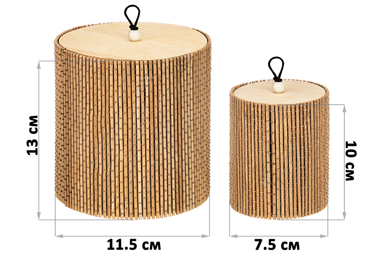 Набор 2 круглых ёмкостей для хранения размерами 11,5х11,5х13 см и 7,5х7,5х10 см от бренда ELCASA изготовлен из натурального бамбука. Обратите внимание при получении заказа: комплектация полная, контейнер поменьше поставляется внутри контейнера побольше. Имеют ручки в виде петелек и бамбуковые крышки. Размер банок без крышек 11,5х11,5х12 см и 7,5х7,5х9 см. Натуральный цвет изделий и экологичный материал в составе подчеркивают органичность и гармонию с окружающей средой. Стенки каждого изделия выполнены из бамбуковых палочек. Органайзер можно использовать для хранения любых мелочей на столе или комоде: украшений и заколок, резинок для волос и бижутерии. Бамбуковые шкатулки подойдут не только для хранения, но и украсят домашний интерьер как предмет декора. Внутри маленькой коробки можно хранить нитки, иголки и другие швейные принадлежности. В такой шкатулочке серьги, кольца, цепочки и другие ювелирные изделия будут под рукой и не потеряются. В ванной на полке в баночках можно хранить ватные диски, палочки и другие гигиенические принадлежности. Сундучок позволит держать под рукой мелкую канцелярию и предметы для шитья. Не рекомендуется применять абразивные моющие средства. Бамбук нельзя замачивать! Комплект интерьерных коробочек станет приятным подарком на любой праздник и позволит держать мелкие аксессуары под рукой. Сделайте сюрприз своим близким, эстетичные ёмкости пригодятся любой женщине. Используйте маленький бокс для хранения любых вещей на свое усмотрение. Комплект небольших декоративных ёмкостей украсит полочку, туалетный столик и поможет создать порядок в любом пространстве! В коллекции бренда ELCASA представлено много стильных товаров для дома, выберите вариант на свой вкус.