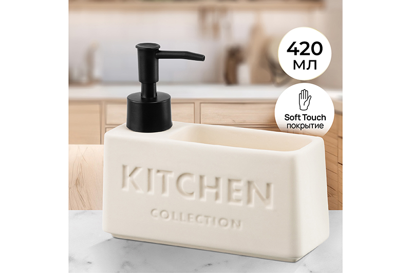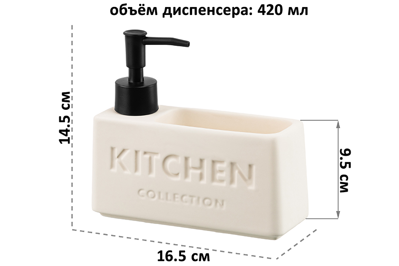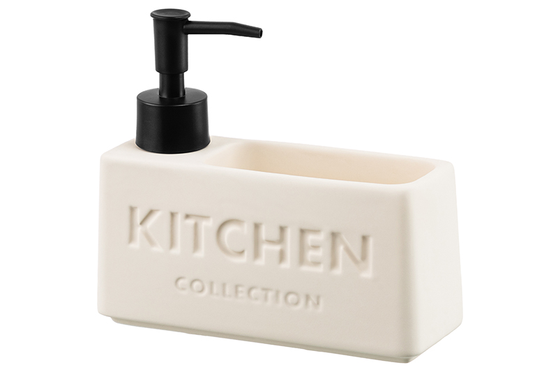 Настольный диспенсер подойдёт для хранения жидких моющих и очищающих средств. Размер изделия – 16,5х5,5х14,5 см, объём – 420 мл. Баночка выполнена из керамики, её поверхность имеет матовый финиш и украшена надписью «Kitchen Collection» («Коллекция для кухни»). Пластиковый дозатор поможет удобно извлечь необходимое количество средства. Стильный аксессуар дополнит вашу кухню, а лаконичный дизайн впишет его в интерьер любой квартиры! Заполните ёмкость жидким мылом или средством для посуды и расположите на кухонной раковине. Герметичная бутылочка не допустит проливаний. Имеется отделение для губки – вы сможете хранить под рукой всё необходимое для мытья посуды. Закруглённое донышко позволит вам легко избавиться от жидкости, которая скопилась от губки. Не рекомендуется применять абразивные моющие средства. Не подходит для использования в посудомоечной машине. Для очистки изделия пользуйтесь тёплой водой с добавлением моющего средства. Поставляется в стильной картонной коробке – вам не потребуется дополнительная подарочная упаковка. Декоративный диспенсер станет отличным подарком для родных и близких. Это не только практичное, но и эстетичное решение для организации чистоты и порядка в вашем доме.