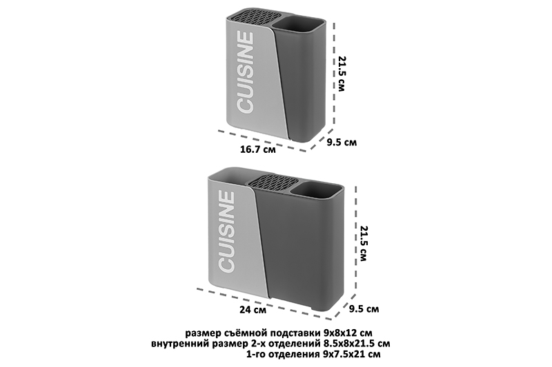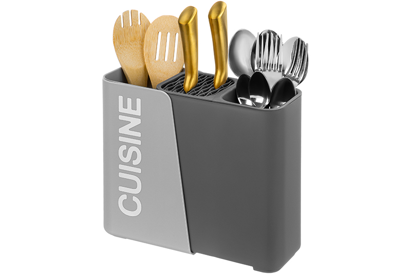 Органайзер для столовых приборов Elan Gallery "Серый" размером 16,7х9,5х21,5 см выполнен из пластика в универсальном дизайне и подойдёт к любому интерьеру. Пластиковый держатель для кухонной утвари имеет два глубоких отделения, внутренний размер каждого – 8,5х8х21,5 см. В одном из отделений есть съёмный стакан размером 9х8х12 см с отверстиями на дне, во втором – съёмная подставка с разделителями для хранения ножиков. Благодаря этому излишки воды будут стекать со столовых приборов в ёмкость подставки. Сушилка для кухонного инвентаря раздвигается в длину, образуя третье дополнительное отделение размером 9х7,5х21 см. Можете использовать его для организации хранения половников и лопаток. Общий размер изделия в разложенном виде – 24х9,5х21,5 см. Подставка подходит для хранения ножей, вилок, ложек и других кухонных принадлежностей, обеспечивая легкий доступ и удобство использования. Раздвижной контейнер с разделителями поможет организовать удобное хранение и уместит большое количество столовых приборов. Вы можете разместить лоток на столе, раковине или в шкафу, чтобы организовать порядок на вашей кухне. Благодаря стильному дизайну позволит хранить столовые приборы даже на открытой полке. Настольная подставка подходит не только для хранения, но и сушки столовых приборов возле мойки. Поставляется в картонной упаковке. Ёмкость для приборов выполнена в универсальных серых и графитовых оттенках и поможет создать порядок и чистоту на вашей кухне. В коллекции бренда Элан Галерея представлено много функциональных товаров для дома, в том числе стильная посуда и кухонные аксессуары. Выберите варианты на свой вкус!