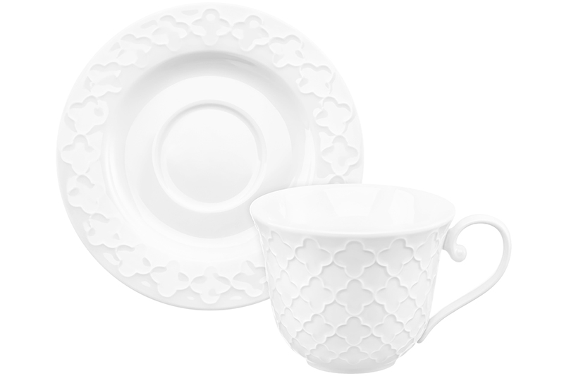 Чайная пара Elan Gallery "Арабеск" выполнена из белого фарфора и украшена рельефными узорами. В набор входят: чашка размером 13х10х8 см и объёмом 300 мл, блюдечко размером 14х14х1,5 см. Чашка с блюдцем для десерта подходят ценителям чая и кофе, которые любят пить из красивой и элегантной посуды. Кружка с небольшой тарелочкой украсят ваш стол своим красивым дизайном как на праздник, так и в будни. Это идеальный вариант для того, чтобы согреться горячим чаем или ароматным капучино. Используйте блюдце как подставку для чашки, чтобы порадовать гостей изящной сервировкой. Положите на блюдо кусочек торта, домашнего пирога или пирожное. Небольшая тарелка подойдёт не только для десерта, но и закусок: сырной нарезки, сырокопчёной колбасы или свежих овощей и зелени. Идеально для завтрака, ведь хороший день начинается с чашечки любимого напитка в красивой кружке. Не рекомендуется применять абразивные моющие средства. Можно использовать в микроволновой печи и посудомоечной машине. Поставляется в красивой картонной коробке. Станет приятным подарком на любой праздник. Благодаря стильной коробочке не понадобится подарочная упаковка. Чашка с десертным блюдцем станут украшением вашей кухни или приятным сюрпризом для близких. В серии "Арабеск" вы найдёте разнообразную сервировочную посуду для вашего дома, соберите целый сервиз на свой вкус! /