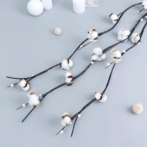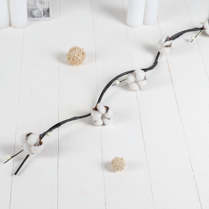 Ветки декоративные «Хлопок с шариками», высотой 150 см, в белом цвете — идеальное украшение для праздничного интерьера. Они подчеркнут стиль вашего дома, будь то датский, классический, скандинавский или шебби-шик. Основной материал стебля — натуральная лоза, цветков — мягкая вата. Прекрасно подходят для новогоднего декора, добавляя уют и изысканность в ваш дом.