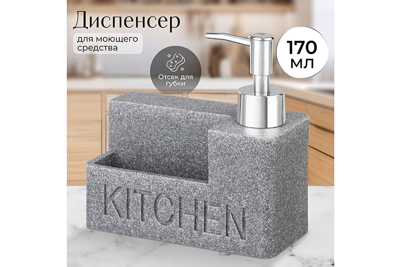 Настольный диспенсер от Elan Gallery подойдёт для хранения жидких моющих и очищающих средств. Размер изделия – 14,5х6,7х14,5 см, объём – 170 мл. Высота без дозатора – 9,3 см. Выполнен из полирезина – современного материала, отличающегося лёгкостью и устойчивостью к влаге. Он не выделяет вредных веществ и не впитывает посторонние запахи. Благодаря высокой прочности изделие надолго сохранит привлекательный внешний вид. На серую поверхность с песочной текстурой нанесена впалая рельефная надпись «Kitchen» – «Кухня». Дозатор серебристого цвета выполнен из пластика. Он герметичен и надёжно предотвращает проливание. Благодаря красивому дизайну и необычной форме баночка найдёт место в любой части вашей квартиры. Заполните ёмкость жидким мылом или средством для посуды и расположите на кухонной раковине. Имеется отделение для губки – с ним вы можете компактно хранить всё необходимое для мытья посуды. В ванной используйте флакон под гель для душа или шампунь. Универсальную бутылочку можно приспособить под антисептик. Поставьте её на рабочий стол в своей комнате или кабинете, чтобы дезинфицирующее средство было под рукой. Дополнительное отделение можно применить для хранения салфеток, тряпочки для протирки экрана или мелких канцелярских принадлежностей. Не рекомендуется применять абразивные моющие средства. Не подходит для использования в посудомоечной машине. Для очистки изделия воспользуйтесь тёплой водой с добавлением моющего средства. Поставляется в дизайнерской картонной коробке – вам не потребуется дополнительная подарочная упаковка. Декоративный диспенсер от бренда Элан Галерея станет отличным подарком для родных и близких. Это не только практичный, но и эстетичный аксессуар для поддержания гигиены, подходящий под любой интерьер! /