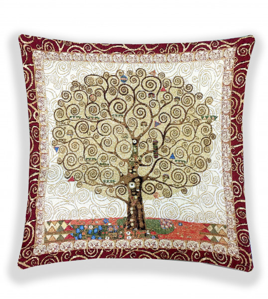 На гобеленовом чехле светлого фона изображено древо, крона выполнена вензелями, на которой есть разноцветные треугольники. По канту идет светлая, потом бардовая полоса в которых идут последовательные геометрические элементы.