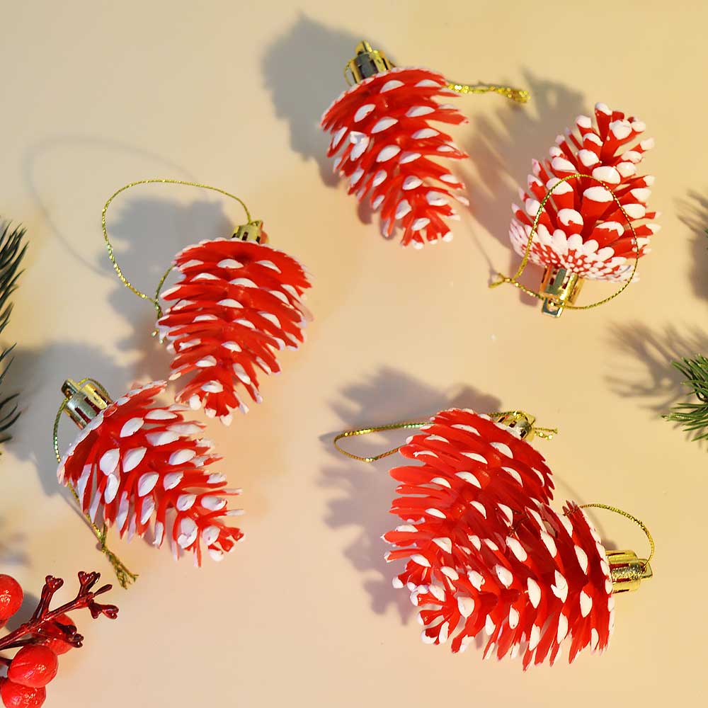 Елочные игрушки 6шт 6см "Шишка", красная с белой каймой