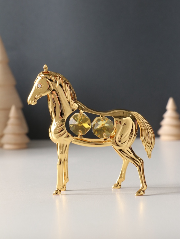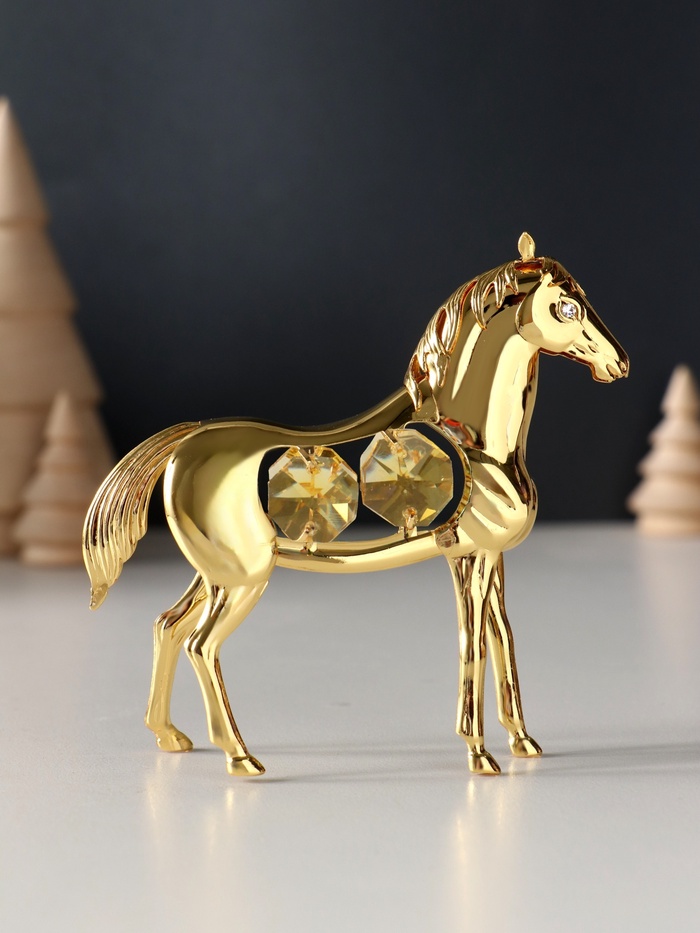 Золотистый силуэт грациозного скакуна с четырьмя солнечными хрусталями — это больше чем просто украшение. Каждая деталь этой фигурки передаёт динамику движения и благородство, воплощённые в металле мастерами декоративного искусства.