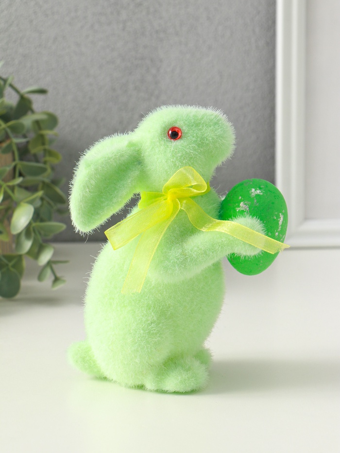 Этот пасхальный заяц с яйцом — лёгкое и тёплое дополнение к празднику. Фигурка из пенопласта с флоковым покрытием приятна на ощупь, напоминая бархат. Зелёный оттенок с мятными переливами создаёт свежую весеннюю атмосферу. Размер в 15,5 см позволяет зайцу стать заметным акцентом на праздничном столе или в пасхальной композиции, не занимая много места.