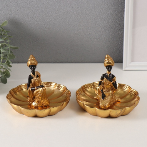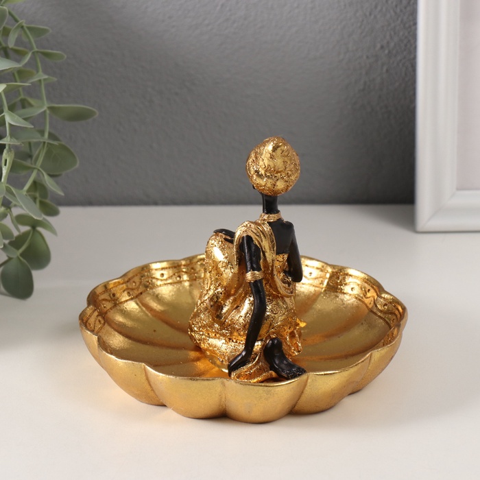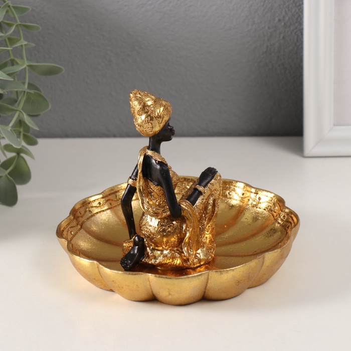 Фигурка - подставка для мелочей «Африканка в тюрбане, на цветке», полистоун, золото, 14×15×12.5 см, МИКС