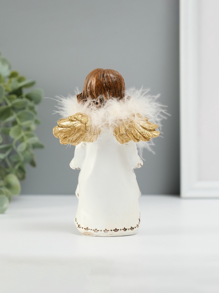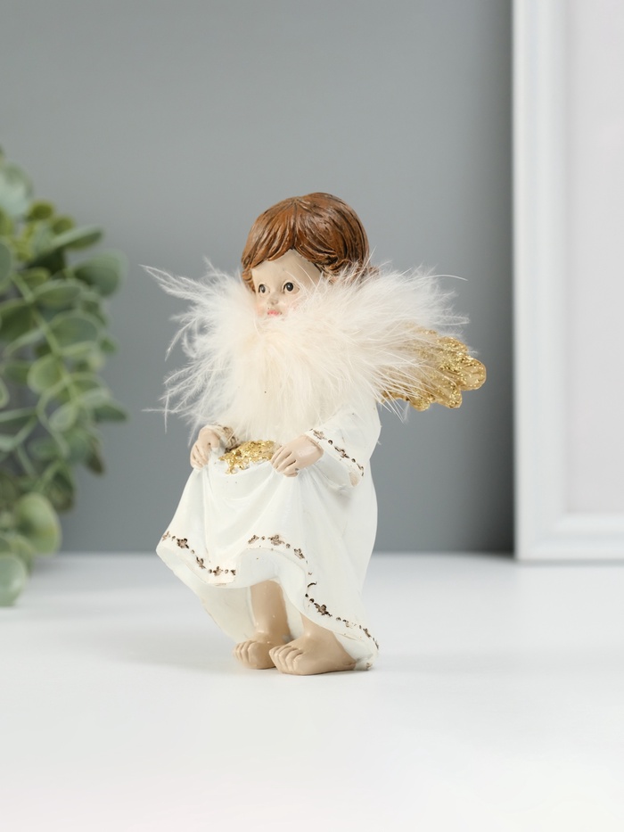 Фигурка полистоун «Ангелочек со звёздами в подоле», пух, золотые крылья, 8.5×7×13 см